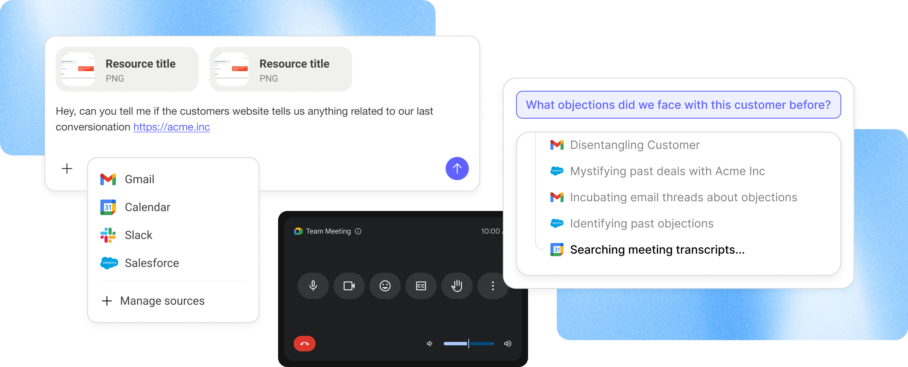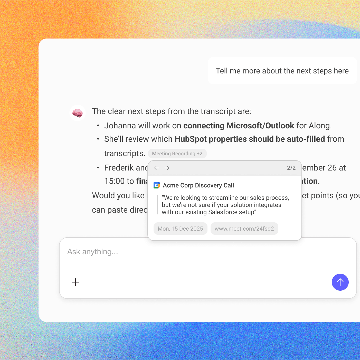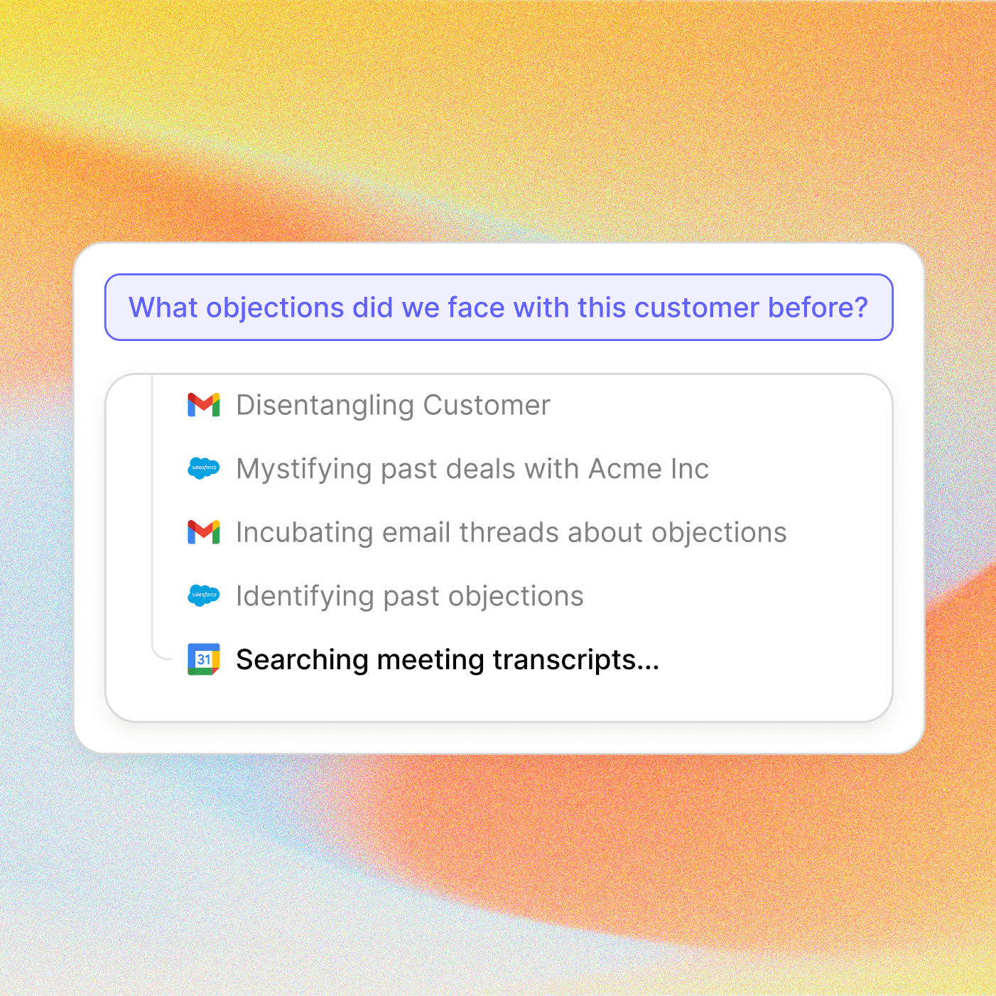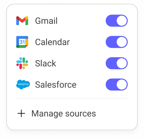 Get instant answers to your connected data from your CRM, emails, calls, Slack, files, anywhere.