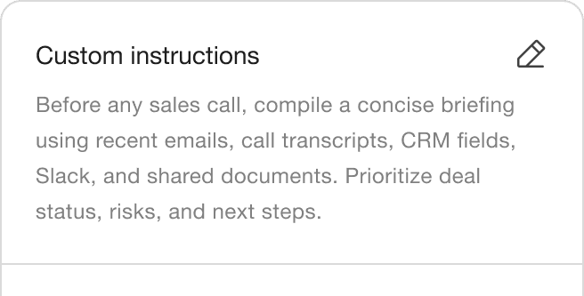 Pulls “everything that matters” to prep a call or QBR: who’s involved, current stage, open threads, risk, next meeting agenda, recent engagement signals, exec summary, measurable outcomes/ROI and more.